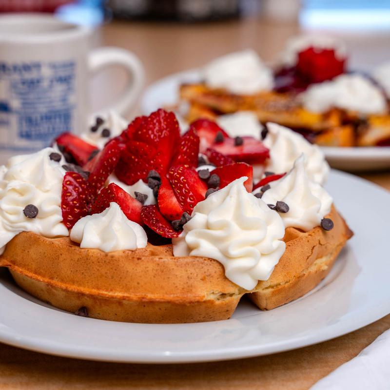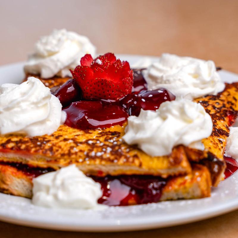 Topped with Nutella, fresh bananas, strawberries, and whipped cream.