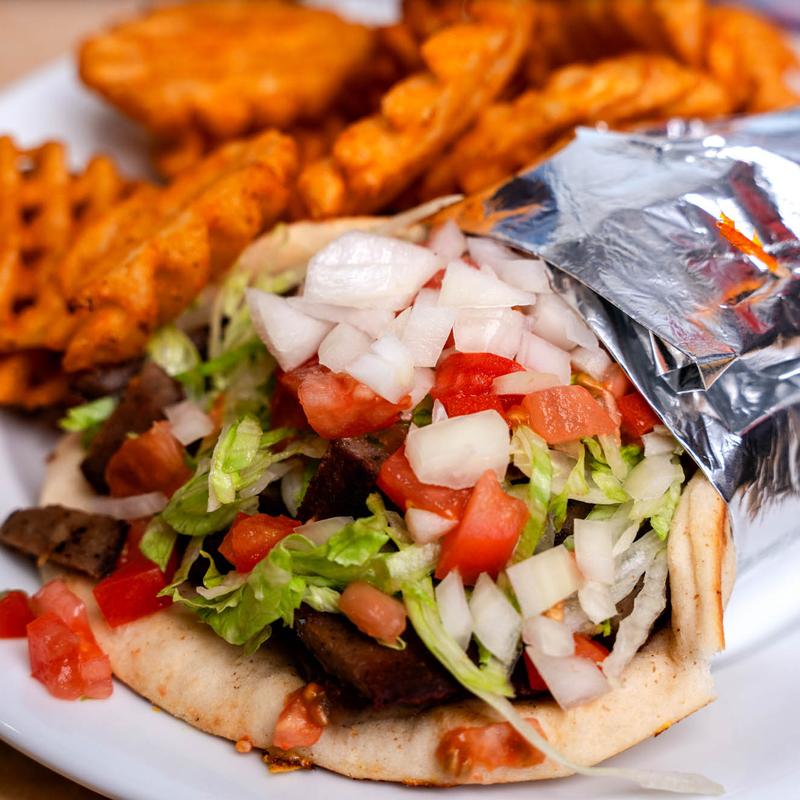 Gyro meat, onions, and tomatoes with tzatziki sauce.
