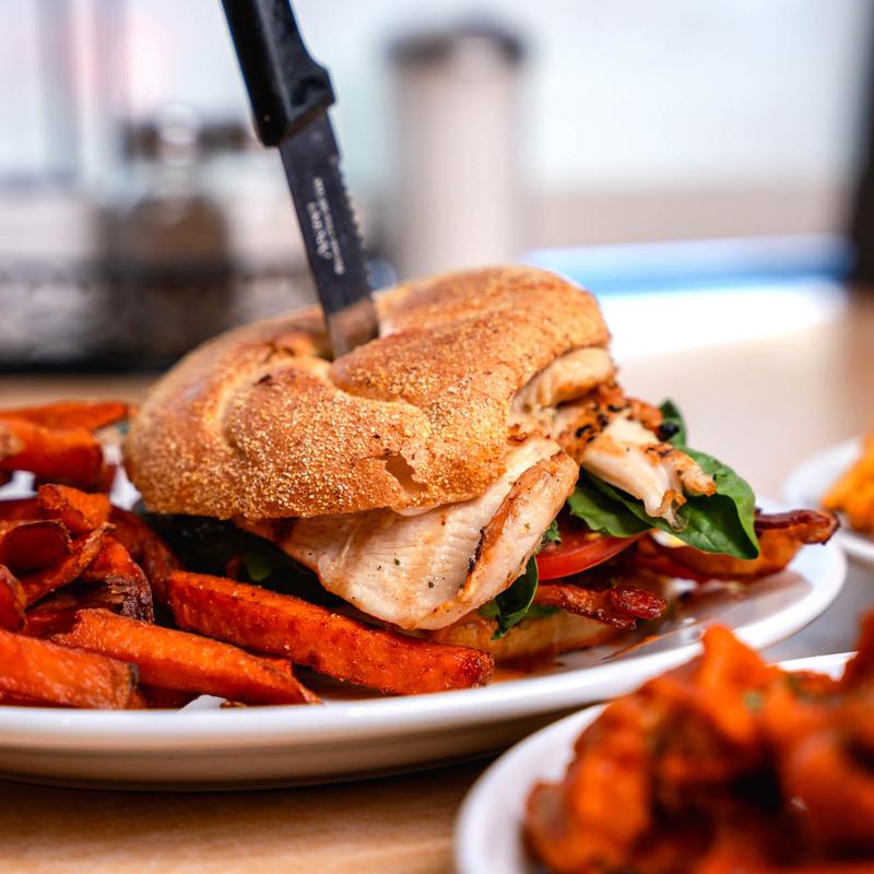 Fresh turkey breast, bacon, tomatoes, baby spinach & cheddar cheese.