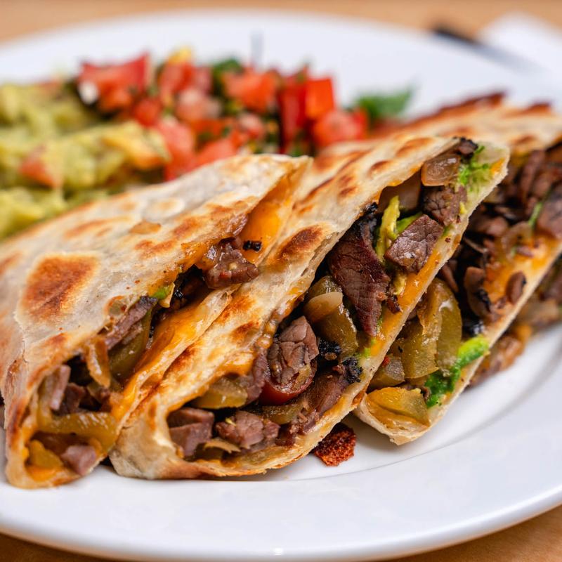 Choose from steak or chicken with sauteed onions & peppers served with fresh flour tortillas, guacamole, shredded cheese & pico de gallo.